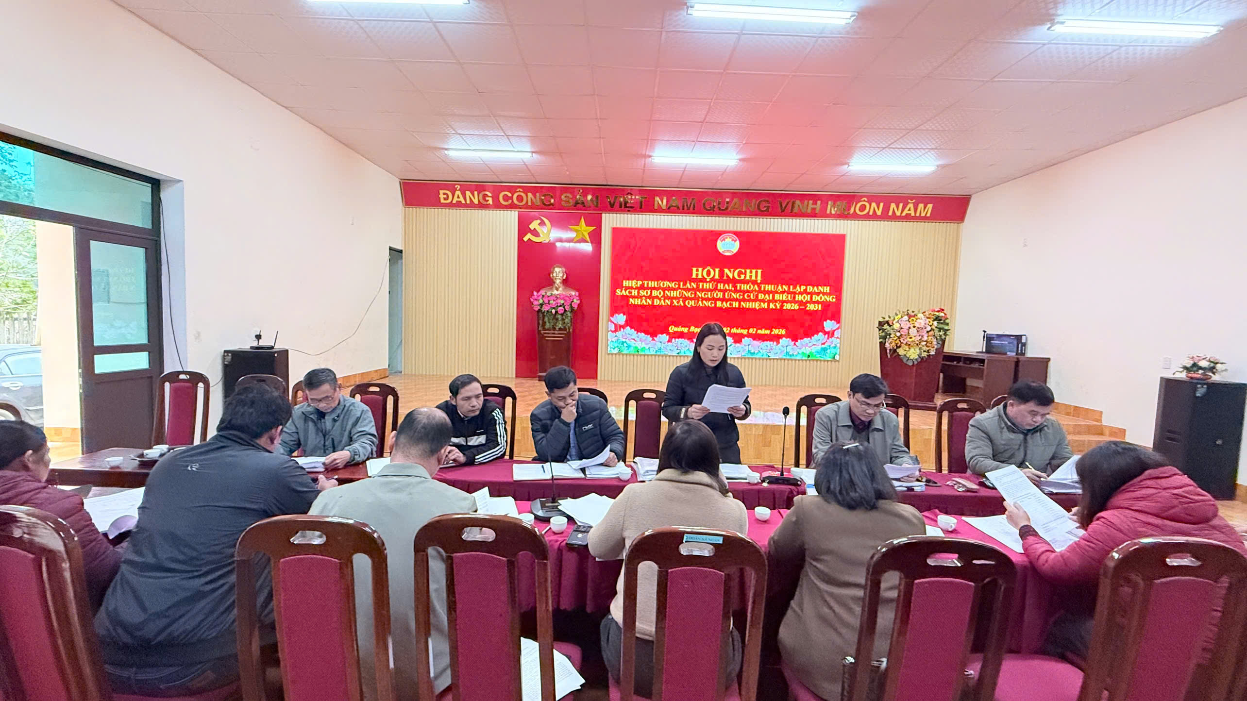 Căn cứ Nghị quyết: 101/2025/UBTVQH15 ngày 26 tháng 9 năm 2025 của Uỷ ban Thường vụ Quốc hội quy định chi tiết, hướng dẫn việc tổ chức hội nghị cử tri; việc giới thiệu người ứng cử đại biểu Hội đồng nhân dân nhân dân cấp xã ở thôn, tổ dân phố; việc hiệp thương, giới thiệu người ứng cử, lập danh sách người ứng cử đại biểu Quốc hội, đại biểu Hội đồng nhân dân trong bầu cử bổ sung; Căn cứ Nghị quyết liên tịch số 102, ngày 26 tháng 9 năm 2025 Hướng dẫn quy trình hiệp thương, giới thiệu người ứng cử đại biểu Quốc hội khoá XVI, đại biểu Hội đồng nhân dân các cấp nhiệm kỳ 2026 - 2031. Chiều ngày 02/2/2026, Uỷ ban MTTQ xã Quảng Bạch hội nghị hiệp thương lần thứ hai thoả thuận cơ cấu, thành phần, số lượng người ứng cử đại biểu Hội đồng nhân dân các cấp khóa XXI, nhiệm kỳ 2026 - 2031.